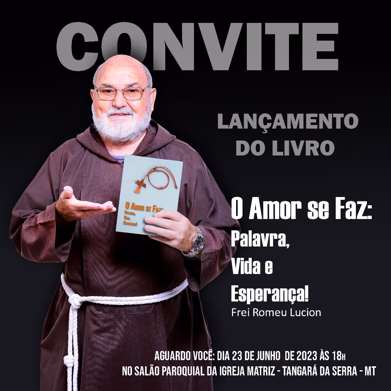 Frei Romeu Lucion, que atua na Casa de Formação Santa Teresinha em Tangará da Serra, lança hoje, 23 de junho, seu livro intitulado "O Amor se faz: Palavra, Vida e Esperança!" O evento de lançamento e sessão de autógrafos ocorrerá nesta sexta-feira, às 18h, no salão Paroquial da Igreja Matriz Nossa Senhora Aparecida, em Tangará da Serra-MT.
